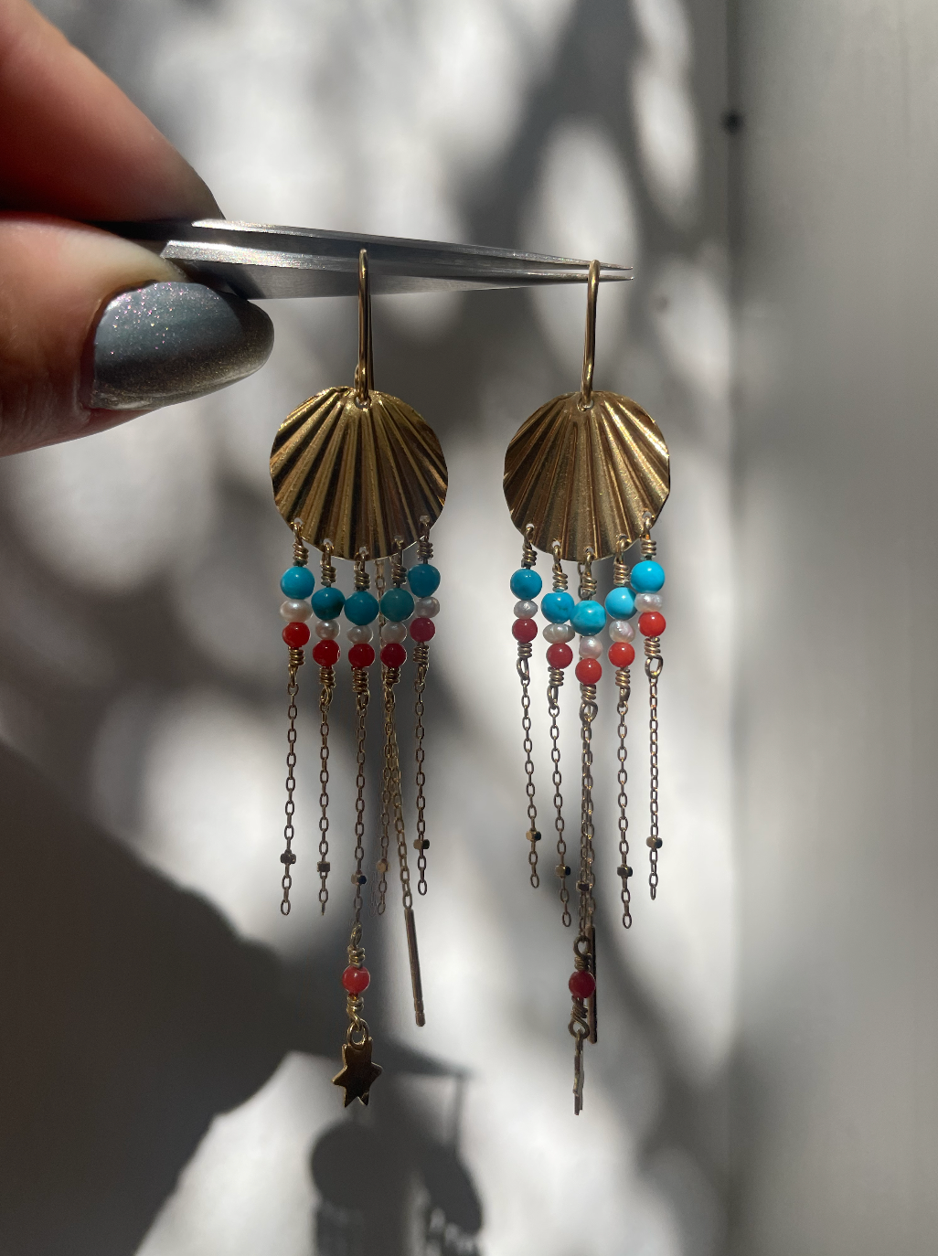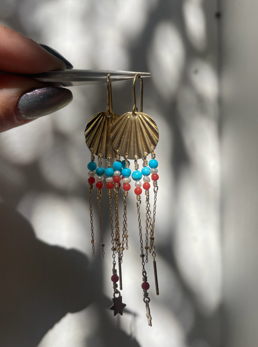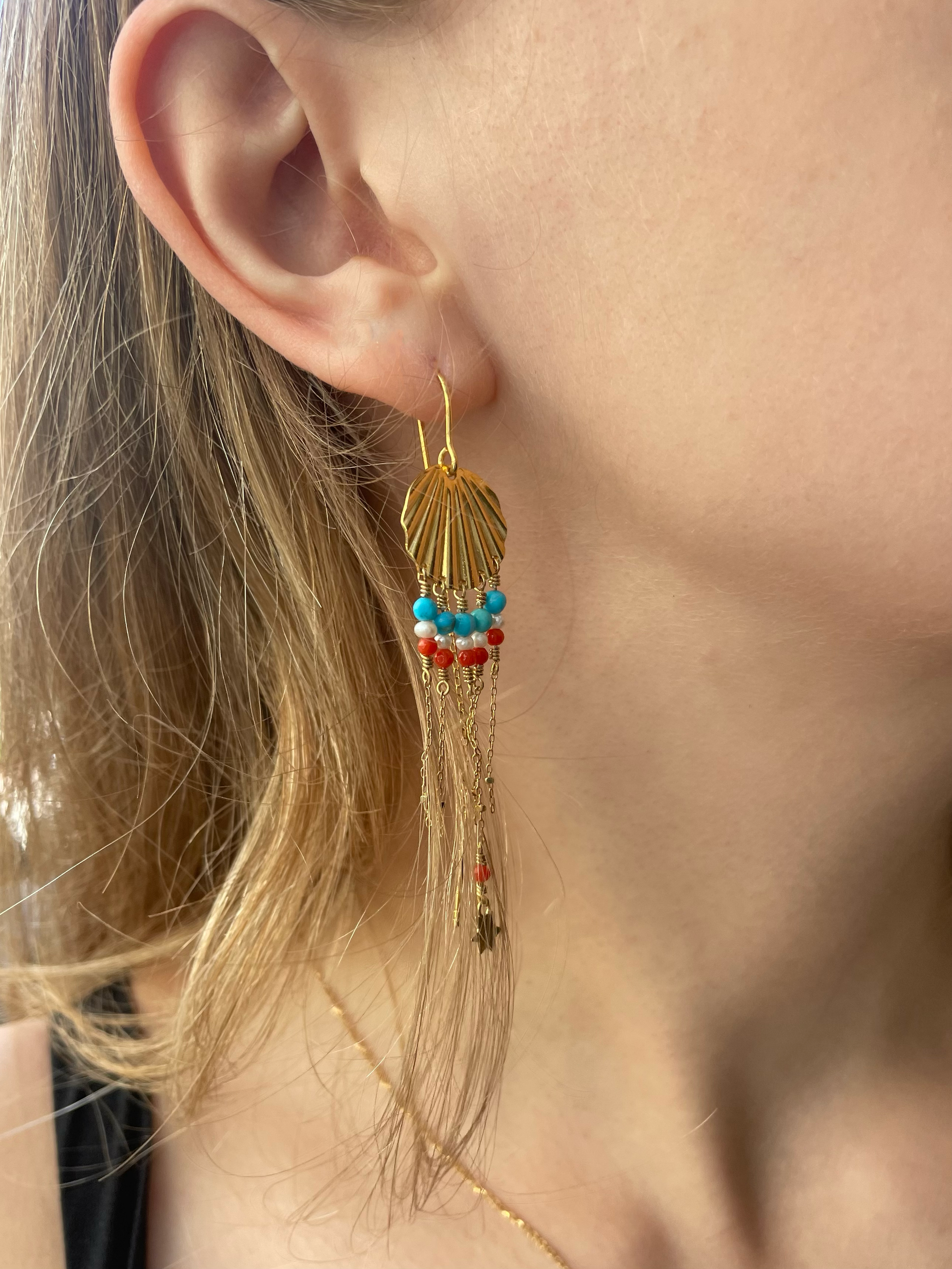 Vores fantastiske art deco-øreringe med koral- og turkisperler. Disse øreringe er fremstillet af forgyldt 925 sterlingsølv og har et levende miks af farver og et dristigt design. De er håndlavede i København og er det perfekte statement-smykke til at lyse op i ethvert outfit.